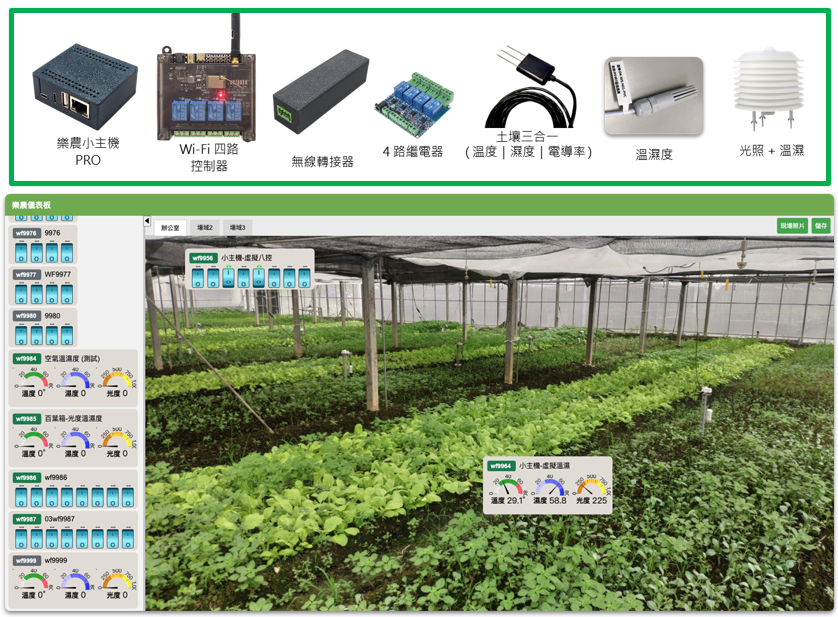 在平台中可以設定各個智慧環境感測器,並將感測器偵測到的數值即時顯示在管理畫面中,可透過遠端監控現場,隨時對農地狀況作應變,達到物聯網與農業的結合。