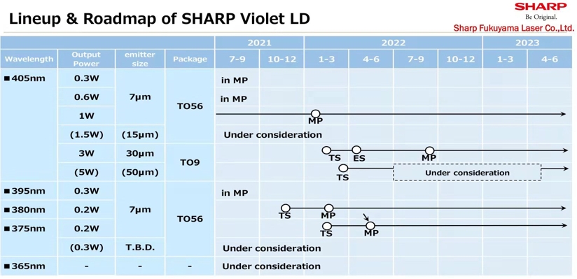 SHARP此次公布最新的roadmap,在405nm(蓝光)这个波段的产品,其中1瓦的产品GH04V01A2G已经量产,预计本年度将推出1.5瓦以及3瓦的产品,